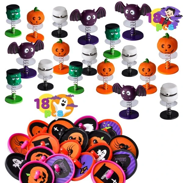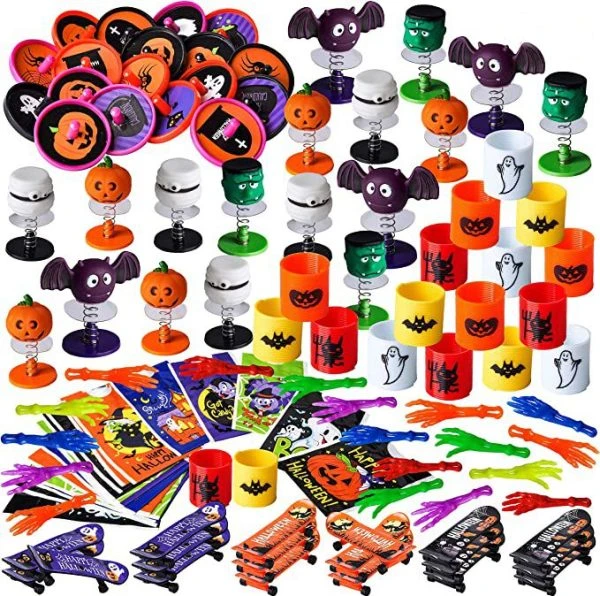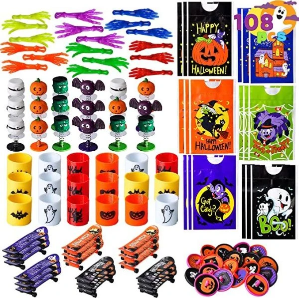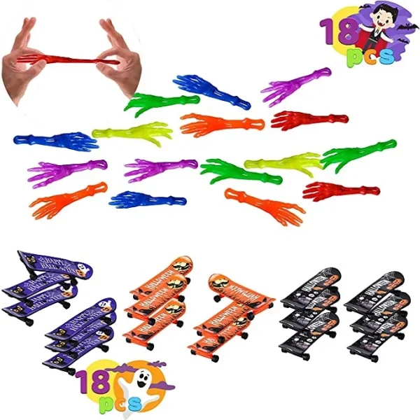 • Halloween Party Favor Includes 18 PCS Goodie Bags, 18 PCS Sticky Hands, 18 Coil Springs, 18 Mini Skateboard Toys, 18 Spinners, and 18 jumping toys