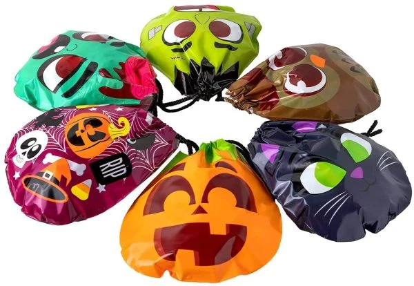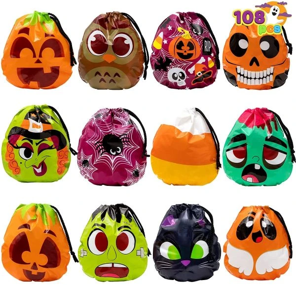 - Our Halloween bag includes 108 pcs of plastic drawstring treat bag with 12 designs. These measure 8×7 inches each. Halloween characters, interactive background & color designs.