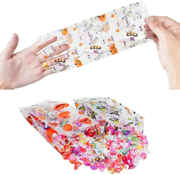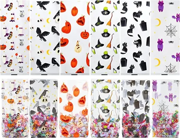 • Halloween Cellophane Treat Bags in 6 Repetitive Patterned Designs. Size: 2”x4”x10”. Suitable as candy storage for party handouts in haunted houses or witch garden parties, game prizes, etc.