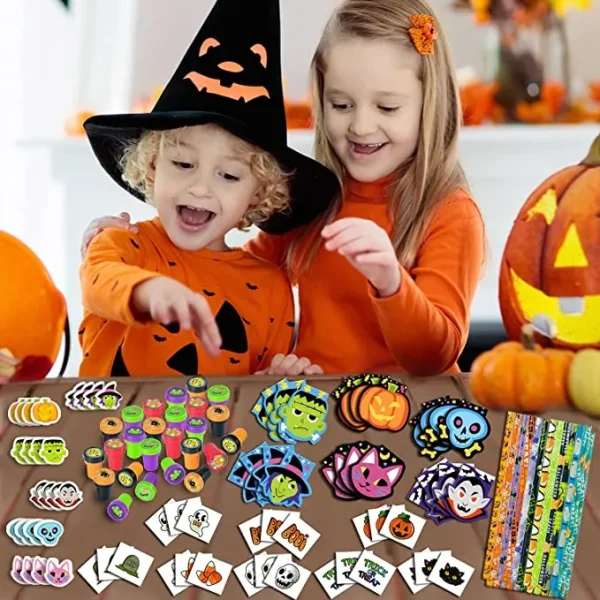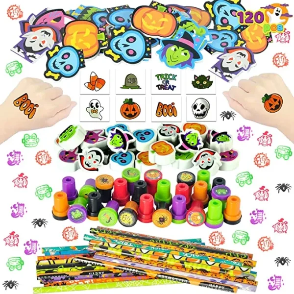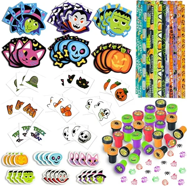 • Our Halloween Kids Stationery Sets include 144 Pcs in 24 Pieces of Rubber, Stampers, Tattoo, Stickers, Small Notebooks, and Pens.