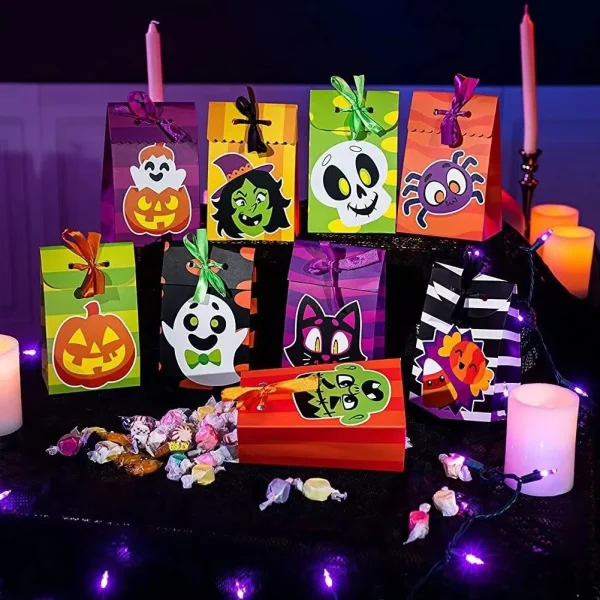 - Our set of Halloween trick or treat goody paper boxes includes 12 pieces of goody paper box containers. The boxes come with 9 bags with 4 ribbon designs. Each box measures 7x 4.5 x 2.8 inch each.