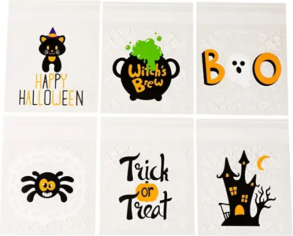 • Clear Halloween Treat Bags includes 150 pcs Cookie and Candy Cellophane Clear Bag features 6 different designs. Perfect for trick or treating!