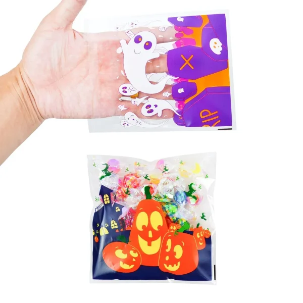 Send tasty Halloween goodies home with your guests in these Halloween cellophane treat bags! The clear plastic bags have a spooky cute ghost, green spiders, bats, mummies, and monsters print to keep your treats safe in stylish goody bags. Food-grade materials are non-toxic, light, strong, and safe for human health, which makes them the ideal packaging choice for candy gifts for kids on Halloween. The cellophane bags are printed with various Halloween elements that are colorful and creative, they add to the festive atmosphere. Essential for trick-or-treating gifts such as candy, nuts, cookies, treats, party favors, chocolates, and berries.
