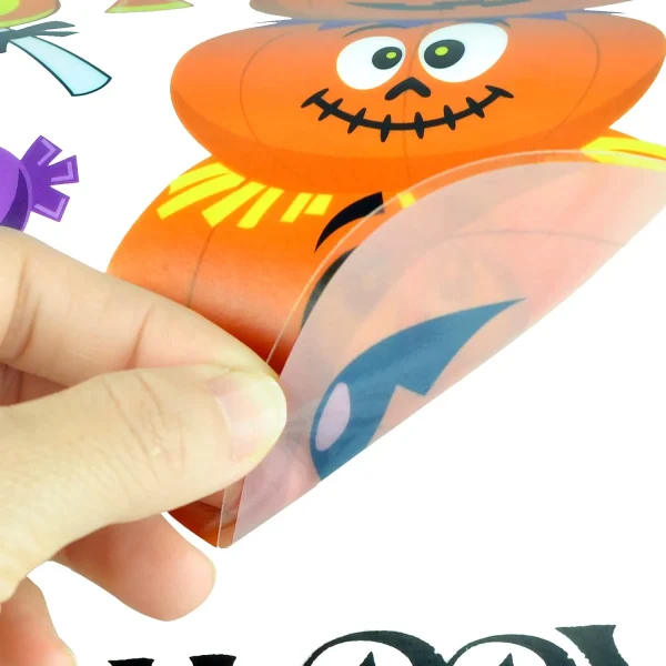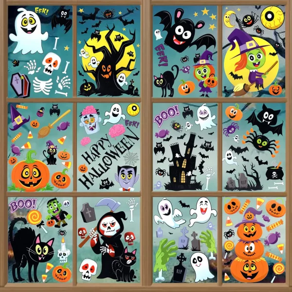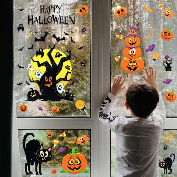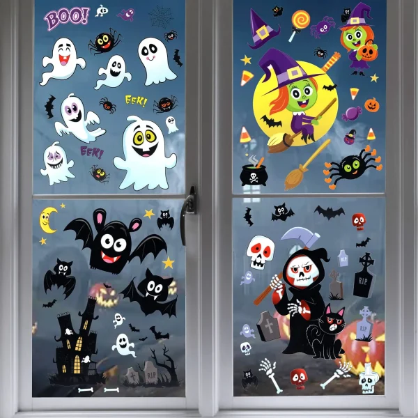 - Our party favor includes 8 sheet Halloween window clings 158 pcs total. These have super cute Halloween-themed designs like ghosts, pumpkins, cats, eyeballs, etc.