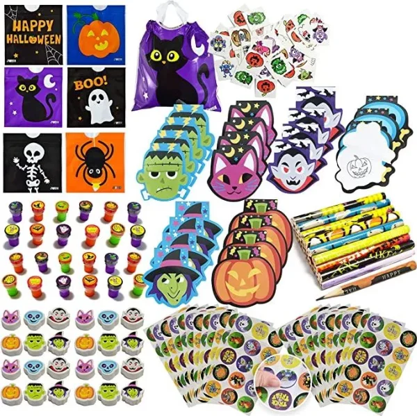 This is a super value set of Halloween stationery. 24 Halloween bags, 24 notepads, 24 temporary tattoos, 24 small pencils, 24 stamps, 24 stickers, and 24 erasers are included in the entire set. This black and orange collection includes a wide range of high-quality pieces for all ages. Perfect for teacher’s classrooms, classroom prizes, home school, birthday parties, and more! All items are great for party favors or giveaways and make perfect decorations for classroom parties and Halloween parties.