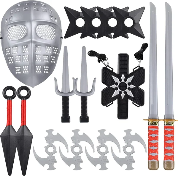 • Ninja Swords Costume includes 2 Katanas, 2 Shurikens, 4 Throwing Discs, 1 Ninja Mask, 2 sais (knives), and 1 Backpack. All Accessories are Made of Plastics, No Metal or Alloy, The plastic used in the product is a flexible material.
