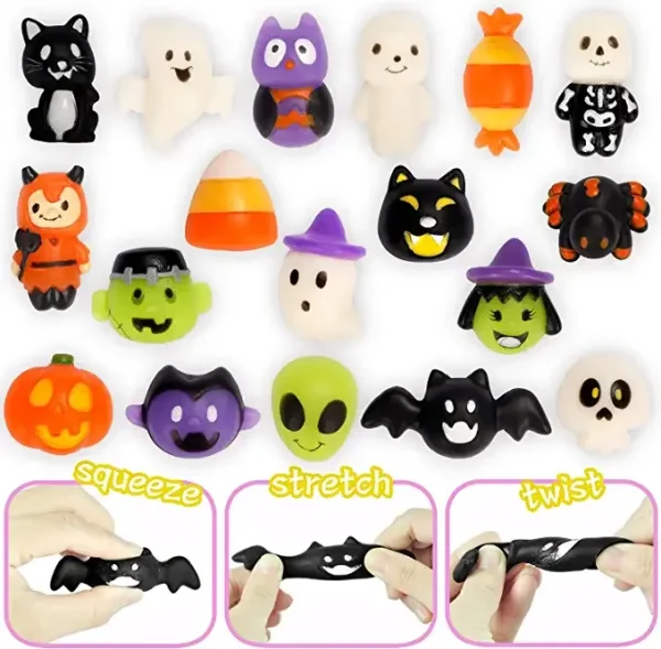 • Halloween Party Favors for Kids includes 18 prefilled pumpkin boxes with Halloween-themed mochi squishy with different designs. A great small toy for children to play with on Halloween.