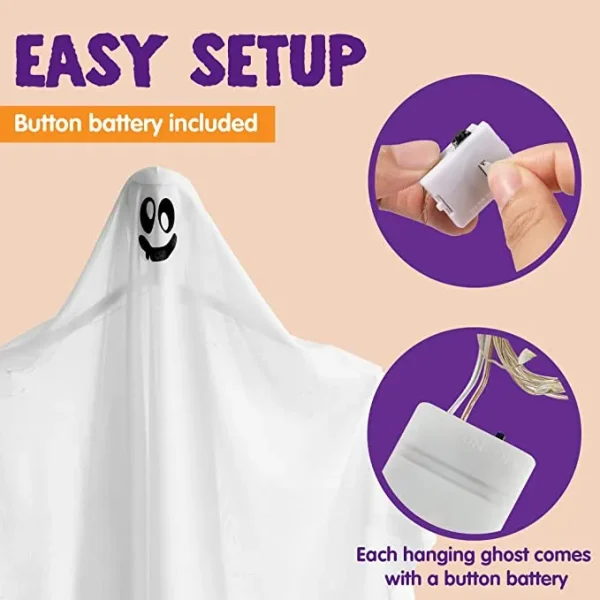 • Hanging Light up Ghosts comes with 2 pieces of 34.5 inches hanging light-up ghosts that are perfect for any Halloween party or event! This Halloween prop featured creepy white light and looks like it’s ready to scare your guests, friends, and trick-or-treaters. Each ghost comes with a button battery.
