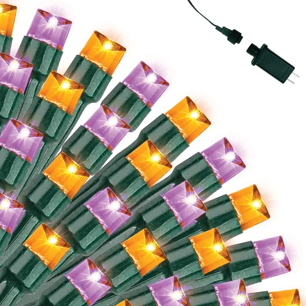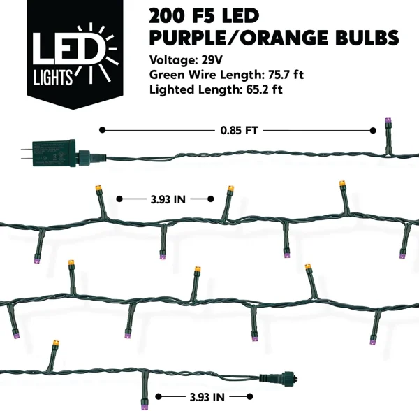 • LED Christmas Light String includes 200 counts of Orange & Purple LED green wire string lights with 8 lighting modes. Each set is 67.3 feet long and has 4 inches of spacing in between each bulb. The bulb’s size is 3 mm x 16 mm. These lights are battery-powered, operated by remote control with a 6-hour timer.