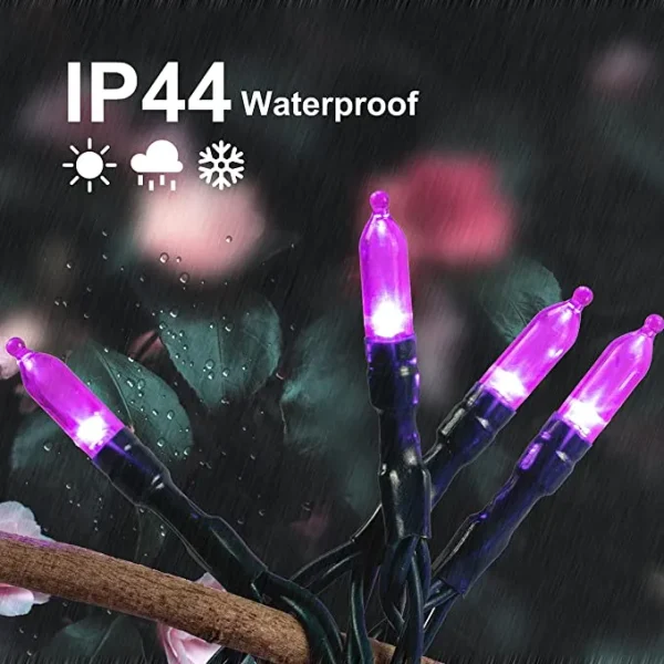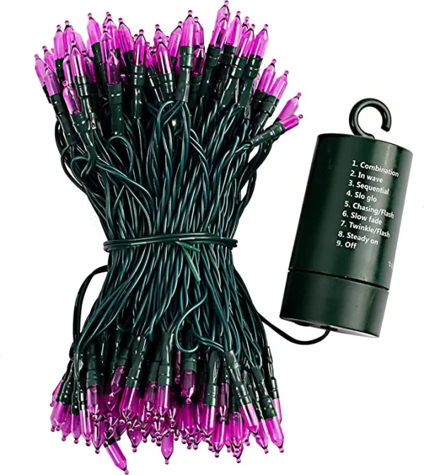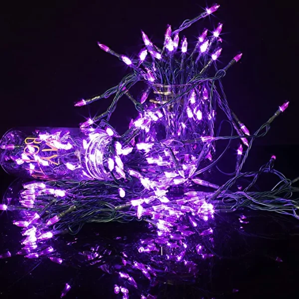 • This Halloween LED Light Strings is composed of 200 counts of purple LEDs in green wire string lights. There are also battery-powered string lights (battery not included) with measurements of 67.3ft. The spacing for each bulb is 4 inches with each bulb’s size of 3mm*16mm.