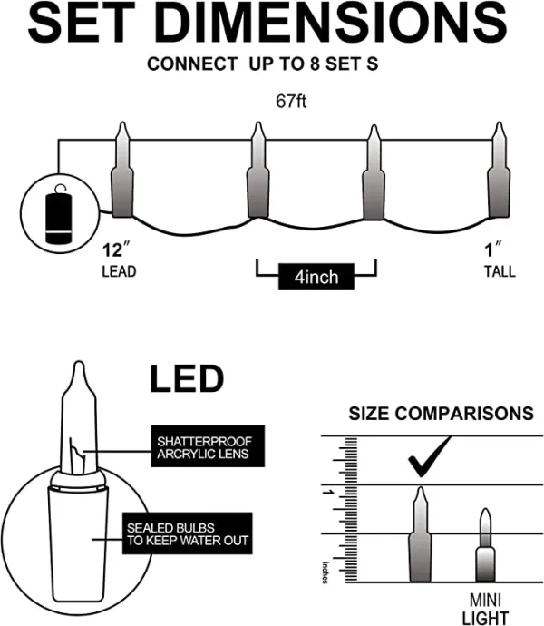 Our LED Christmas lights string is composed of 200 counts of purple LEDs in green wire string lights. There are also battery-powered string lights (battery not included) with measurements of 67.3ft. The spacing for each bulb is 4 inches with each bulb’s size of 3mm*16mm. With the end sockets, these Christmas string lights could be extended up to 8 sets. These are made of high-quality material, with durable insulated wire, our product could be used for a long time.