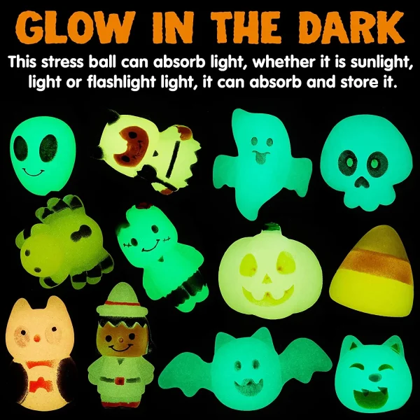 • Our Halloween mochi squishy Toys come in 24 pcs of soft and stress-relieving toys in 12 designs that glow in the dark.