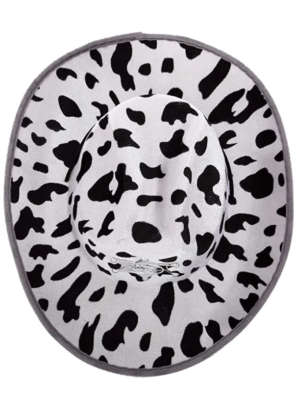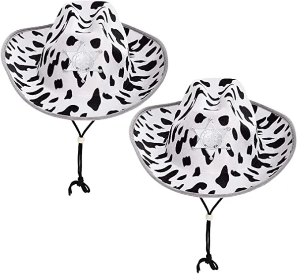 • Cowboy Hat Cow Print features a felt texture. This set comes with 2 cow print felt cowboy hats.