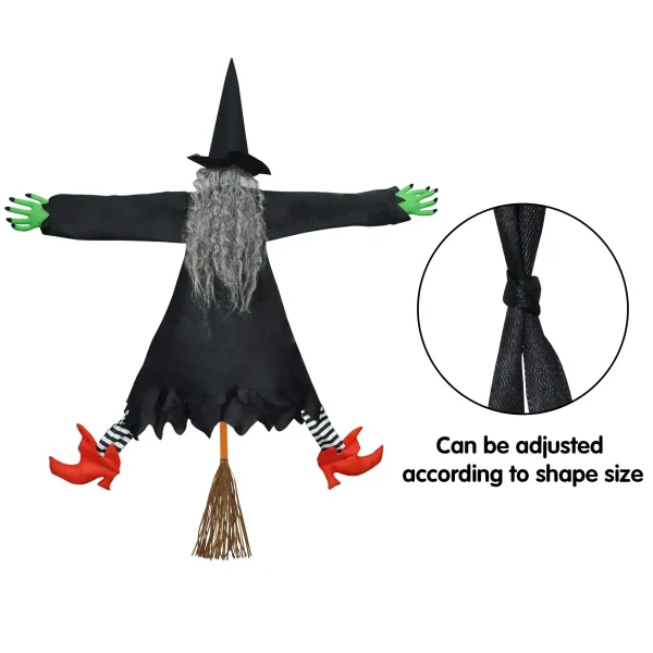 - Two different designs with two hair colors give you extra option for Halloween decorating. The green hands and colorful stocking make this prop looks vivid. The dropping broom and open arms and legs show that she has crushed into the tree, which makes the whole scene looks funny