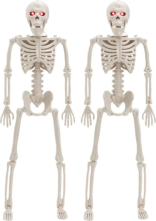 The neighborhood will definitely be talking about these fantastic Halloween plastic skeletons! These full-size, 16-inch-tall skeletons are ideal for use as party décor for Halloween. With their eerie shrieking voices and frightful red LED light eyes, they can frighten guests at the door or join a party in the living room. They may be used repeatedly because they’re composed of sturdy material. Your Halloween décor will have a moving element thanks to the hanging skeleton ornament. To spook your pals, hang them in a shadowy spot around the house. The skeleton’s position may be changed to suit the demands of the scenario thanks to seven flexible moveable joints. It is the best option for creating a dreadful atmosphere for Halloween parties, haunted houses, and horror-themed events.