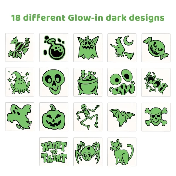 • Our Halloween Tattoo Designs include 1.5 inches by 1.5 inches Halloween Tattoos, 90 pieces of glow-in-the-dark tattoos, and 216 pieces of general tattoos which are a total of 306 awesome pieces!