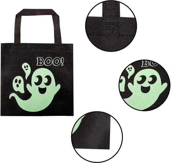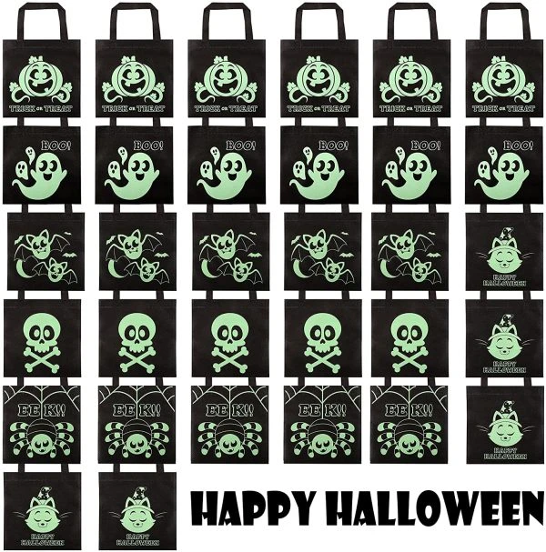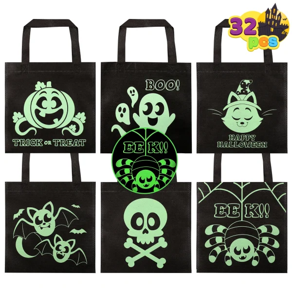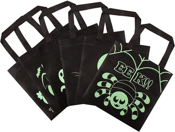 - Our Halloween Trick or Treat Bags include 32 black non-woven bags that measure 8.75x 8.5 inch (22 x 22cm) in 6 unique designs.