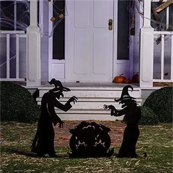 Create your own unique haunted house with this spooky witches silhouette Halloween yard signs with stakes and scare your neighbors. When placed behind a set of light stakes, this black plastic cardboard figure will cast two witches warming up the big black cauldron shadows in your yard. This adds a festive touch to your Halloween decorations. The base of the silhouette is attached to a yardstick for easy installation into the ground. You will undoubtedly terrify your trick-or-treaters. Excellent for Halloween but can also be used all year round on other occasions where you need to spook people out!