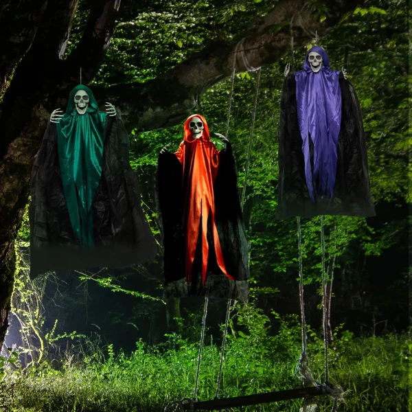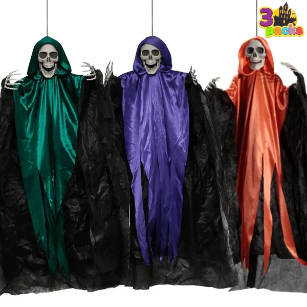 • Hanging Skeleton Decoration Includes 3 different colored designs grim reaper (green, purple, and orange) with the rope being attached to the grim reaper