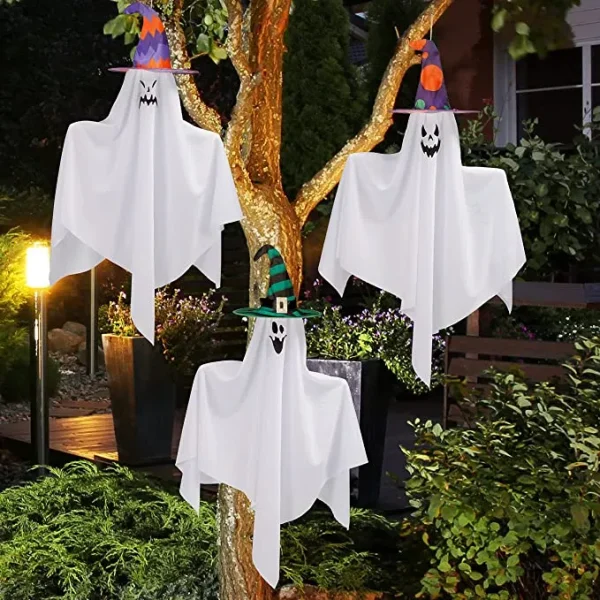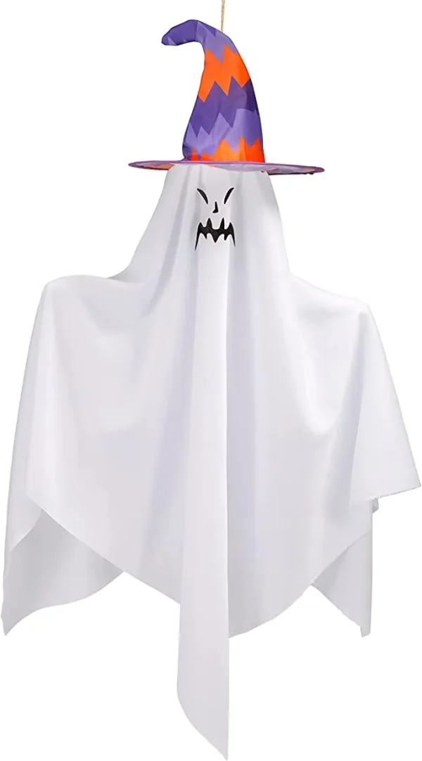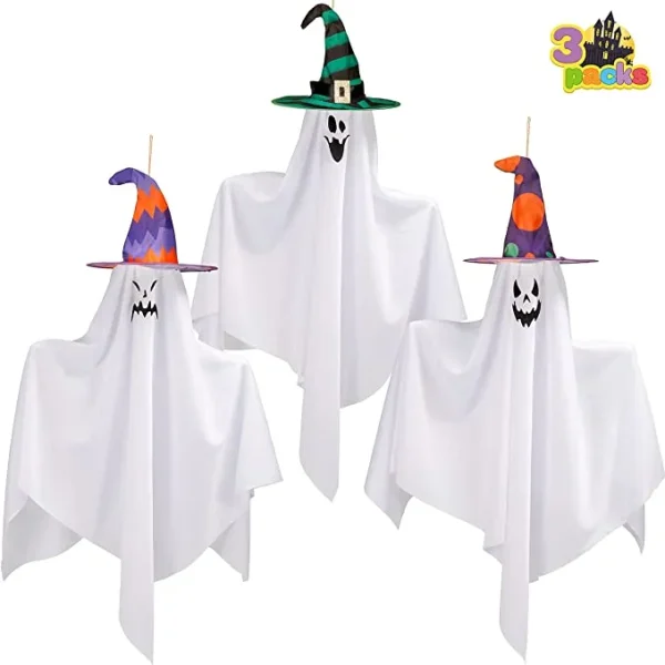 • Our Hanging Ghost Halloween Decorations include 3 Pack Hanging Ghosts with hats, each hat in different patterns. Each ghost has a scary facial expression in black and measures 27.5″.
