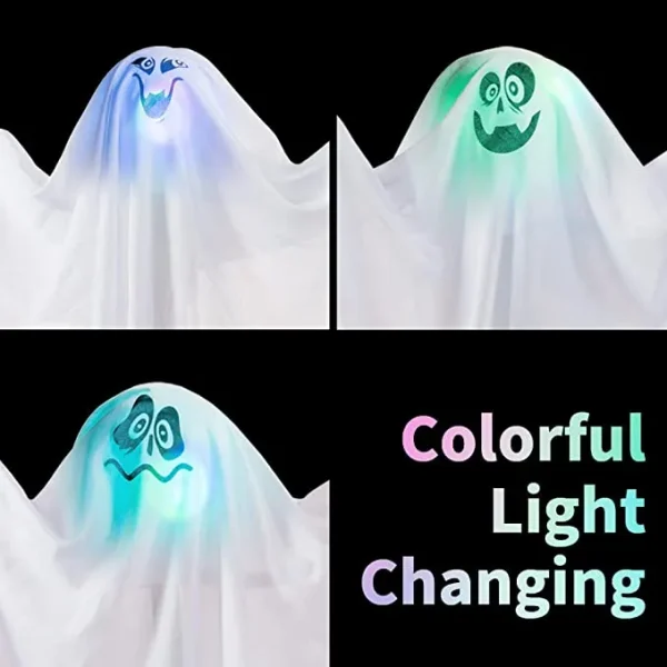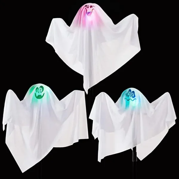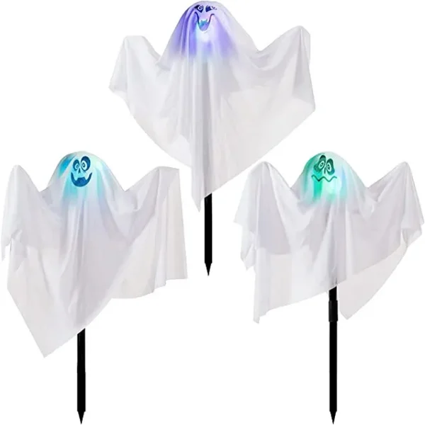 • These Light up Ghost Decorations include 3 Packs of Ghost Lights with Stakes featuring covers of a multicolored LED Light that flashes in different colors.