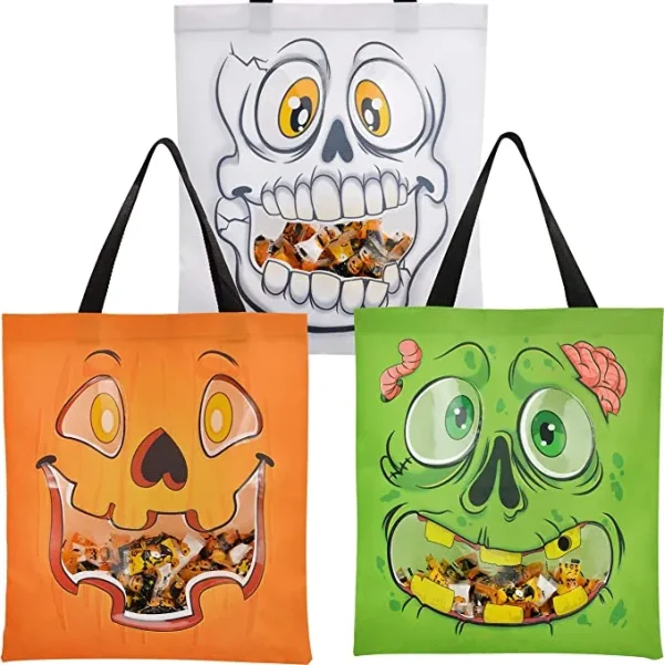 Three see through tote bag in three different designs, each measuring 22.5″ by 13.75″, are included with our Halloween tote bag with a Window. These colorful and festive Halloween See Through Bags with Window help kids keep track of all of their trick-or-treating loot. It is decorated with a festively creepy yet friendly design. This festive candy vessel is roomy enough to fit several full-size candy bars and at least a couple of pounds of the standard treat-size bars. Give your kids this bag to collect treats with after picking out a Halloween costume for them, we have them all! The celebrations start at JOYFY!
