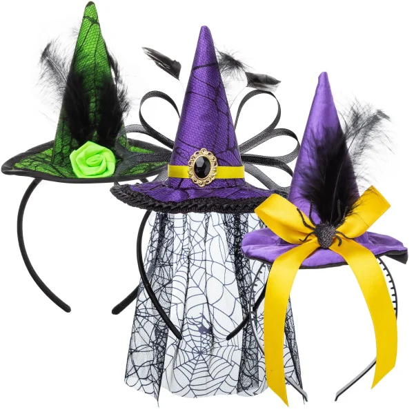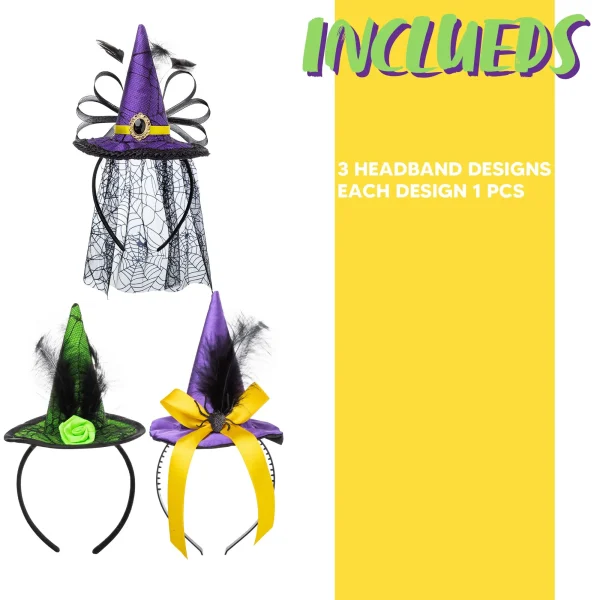 - SUPER VALUE PACK. Our Halloween Accessories for Kids includes 3 packs of Witch Hat Headbands in 3 different designs. These Halloween Witch Headbands will easily match various Halloween outfits and styles and will make your costume stand out and shine!
