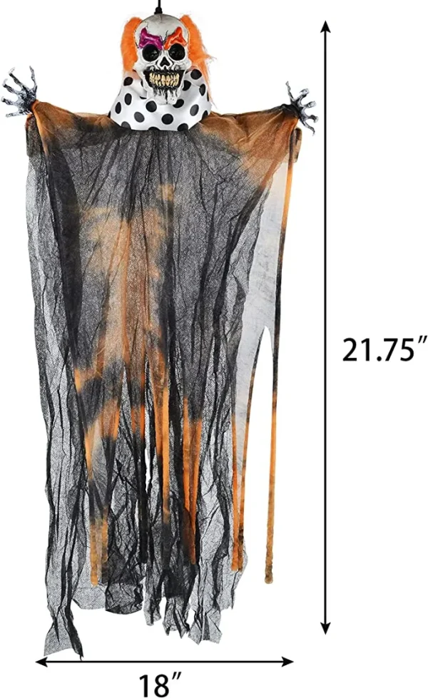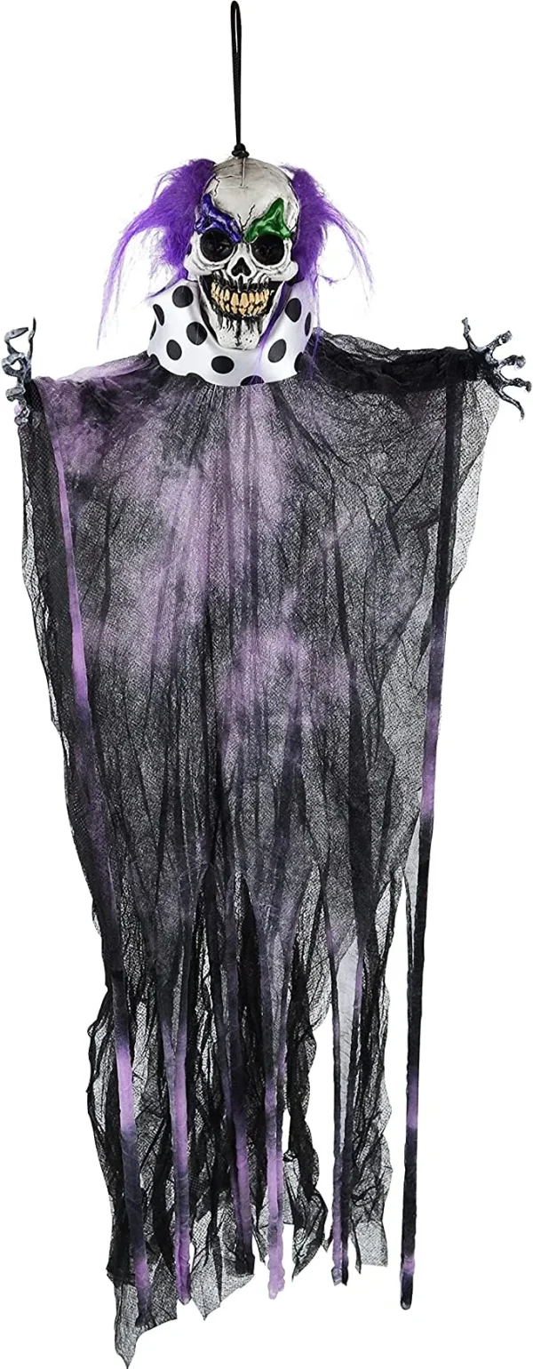 • Hanging Clown Halloween Decoration includes 3 pcs of creepy hanging clown decorations. They feature colorful pattern designs in different colors such as green, red, and purple. Each hanging clown measures 21.75 inches.