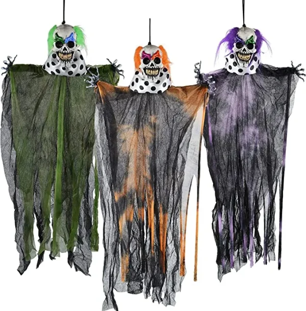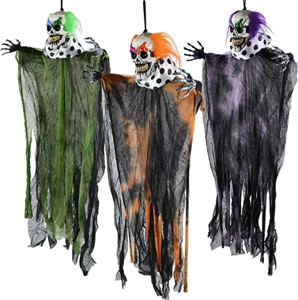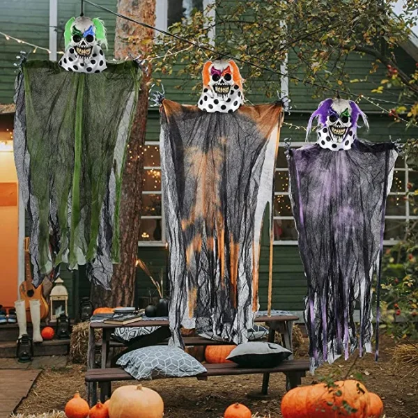• Perfect Halloween hanging decorations to hang in trees, a window, or up the pathway that visitors will walk through, and many more. Add these scary Halloween-hanging creepy clown decorations to your home to complete that Halloween atmosphere. Impress and scare your neighborhood with our clown Halloween decorations outdoors.