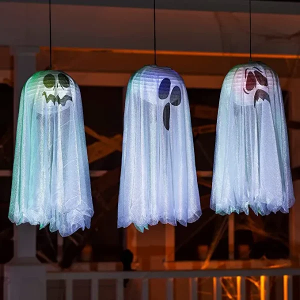 The spooky hanging lighted ghost set includes 3 packs of light-up ghost lanterns. Each lantern measures a length of 18 inches and 6 inches for its diameter. This is perfect to hang indoors/outdoors like on the porch, living room, trees, patio, and many more. Add these impressive Halloween-hanging ghost decorations to your home to complete that Halloween house look. Three interchangeable light colors are available on the hanging ghost Halloween decoration at all times. For added spookiness, it also reacts with 3 different ghost faces. Perfect to hang indoors or outdoors, such as on a porch, in a living area, or in a patio or tree.