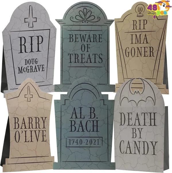 - Our 48 pcs Halloween tombstone paper trick or treat bags comes in 6 spooky design. Each treat bags measures 9.5 x 6.5 x 2.5 inches.