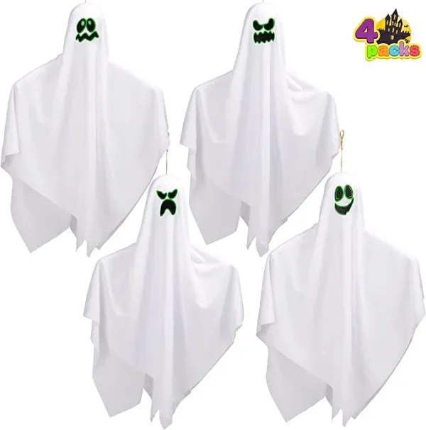 • Halloween Hanging Ghost includes 4 Pack Halloween Glow-in-the-dark Hanging Ghosts with 4 different scary face expressions in black. These hanging ghosts have creepy faces. Their arms can be bent to achieve your desired pose for each of them.