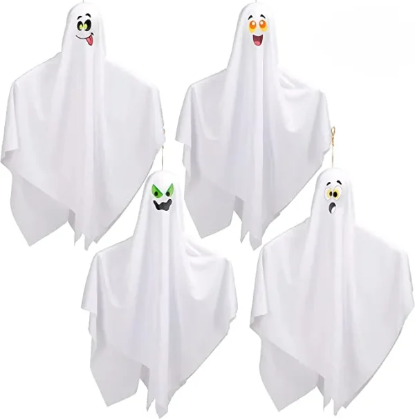 Halloween hanging ghost decoration are very easy to use and make great decorations for Halloween parties, haunted houses, haunted house events or even just decorating around your house during October! You could hang them up at any time of the year if you wanted to add some spooky flair to your home or office space! Each ghost comes with two pieces – the actual ghost body piece which has bendable arms that can be posed any way you like and then there’s a mesh cover that goes over the face of each ghost.