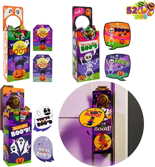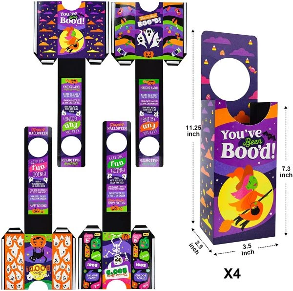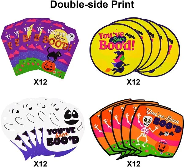 • Halloween Treat Box includes 52 pcs of Cards & Strings with Candy Box set. This has 48 different design styles, each style comes with 1 paper box, 12 you`ve been booed double-sided printed tags with ” we’ve been booed ” printed at back, with colored strings (52 pcs in total). The box measures 3 x 5.25 x 11.25 inches