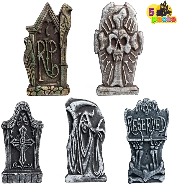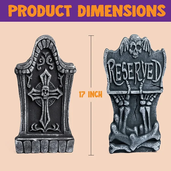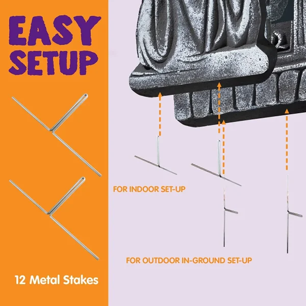 • Halloween Tombstone includes Five 17″ Foam Graveyard Headstones and 12 Metal Stakes for securing the gravestones into the ground for outdoor use.