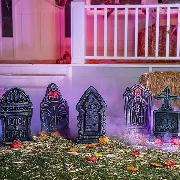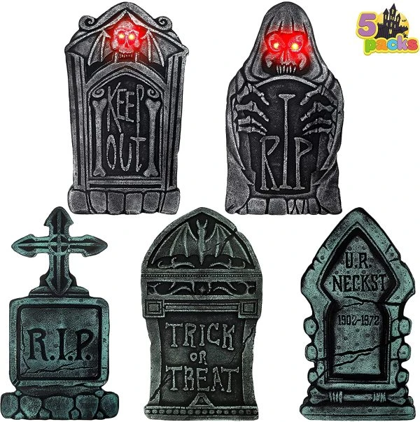 • Our Tombstone Decorations include 5 Pack of Creepy Tombstone Decorations (2 with LED Lights). Great Halloween Yard Sign with Different and Vivid Spooky Designs and Color. Very Easy to Install and made from High-Quality Material. The Tombstones measure 16″.