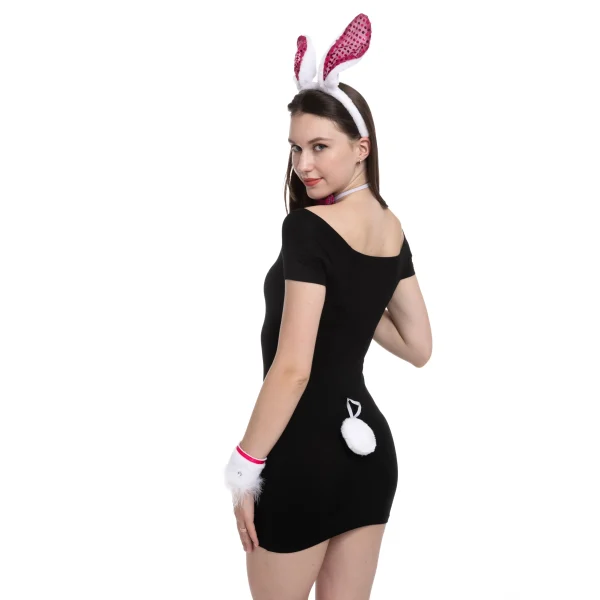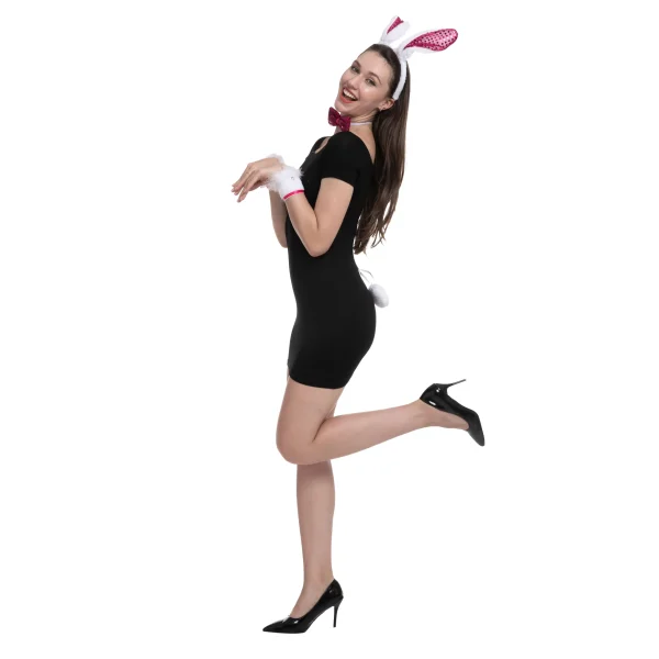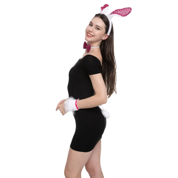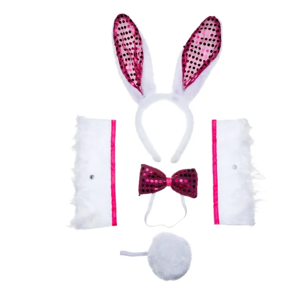 - Bunny Costume Set includes white bunny ears headband, bow tie, bunny tail, and arm cuffs. Fits adult and kids.