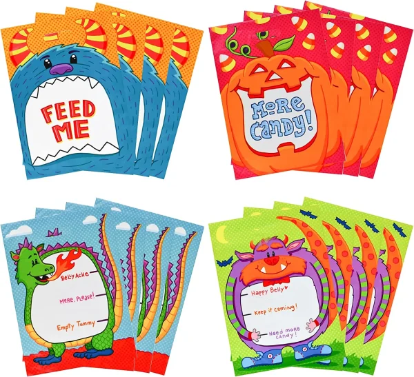 - These large size candy bags are printed double-sided in colorful and vivid multi-character animated designs, but also have a see-through window design to easily see what’s inside the bags. The kids will love the bold and bright expressions of our friendly-looking Halloween monster characters.