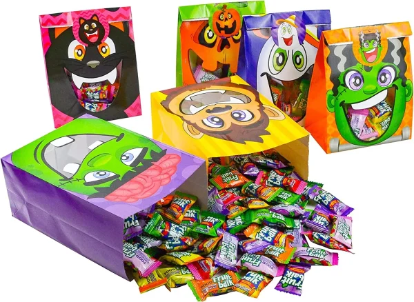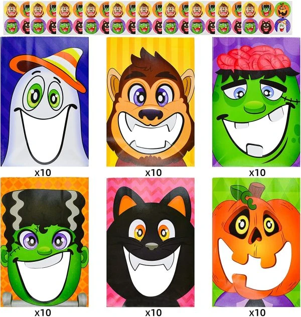 - Our 60 Pcs Halloween Candy Treat Bags (3” X 5” x7”) are designed with a see-through window. These bags come with 60 Halloween character stickers.