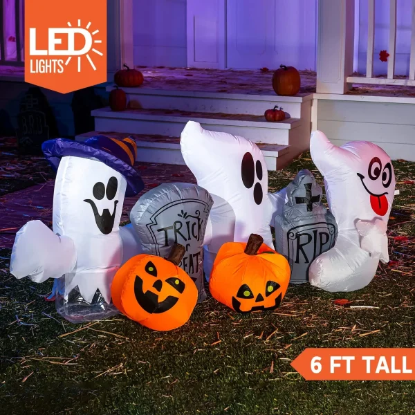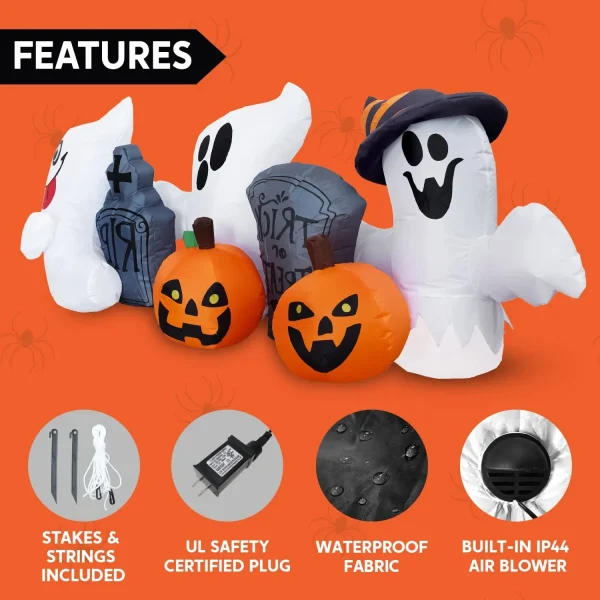 • Halloween Inflatable Ghost includes 6 feet-long horizontal halloween inflatable ghost with tombstones that come with extended cords, ground stakes, fastened ropes, built-in sandbags, and a plug with UL certification.