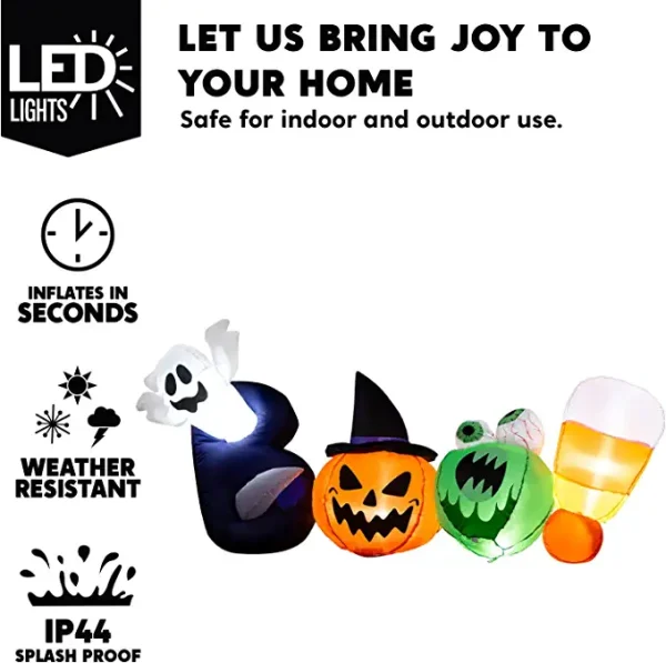 • Boo Inflatable 6 feet long boo inflatable comes with extended cords, ground stakes, fastened ropes, built-in sandbags, and a plug with UL certification.