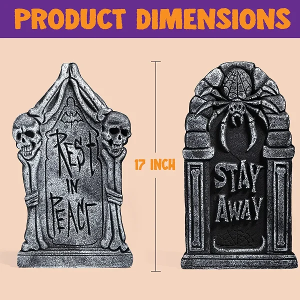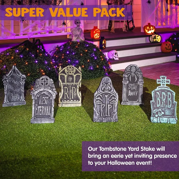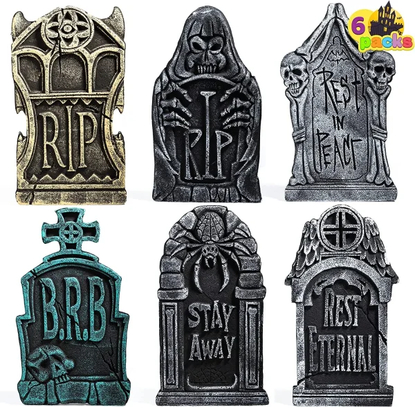 • Halloween Foam Tombstones include Six 17‘’ Foam Graveyard Headstones and 14 Metal Stakes for securing the gravestones into the ground for outdoor use.