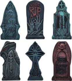 • Halloween Tombstone Decorations Includes – Six 17″ Foam Graveyard Headstones and 12 Metal Stakes for securing the gravestones into the ground for outdoor use
