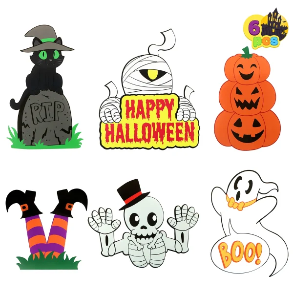 - Our set of Halloween Yard SIgns includes 6 pcs of yard sign props in classic animated Halloween characters design like the stacked pumpkin, upside down witch legs, ghost, mummy, black cat, and skeleton.