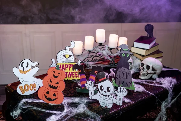 - These yard signs have animated spooky character designs that are very child-friendly. These are also fast and convenient to install. Just insert the metal stakes into the ground to make these cute Halloween decorations stand.