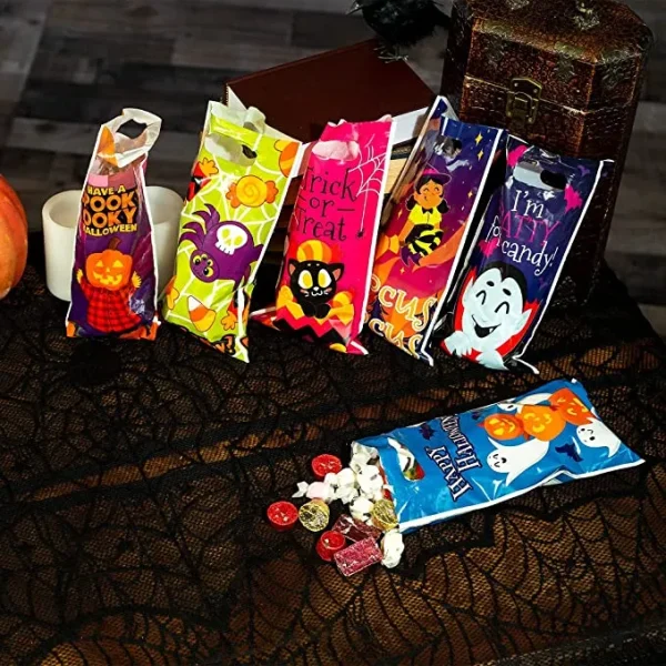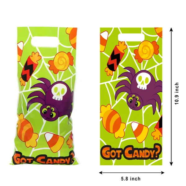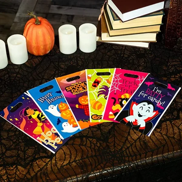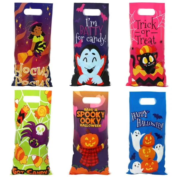 - Our candy bag set comes in 72pcs. Each of the plastic candy bags measures 6″ X11″. The bags have 6 multi-characters & Halloween text designs such as happy Halloween (pumpkin & ghost), trick or treat (candy & black cat), got candy (spider with candy around), have a spooky Halloween (pumpkin head) hocus pocus (witch on the broom), and I’m batty for candy! (vampire)