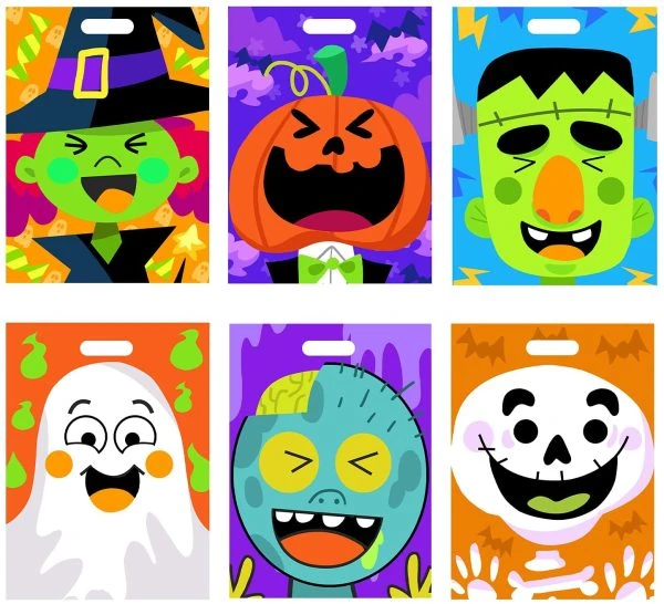 • This Treat Bags for Halloween Candy for kids includes 72 pcs, 6 characters design, with signature facial expressions, featuring different background & color designs, 6 designed signature character face stickers like a ghost, Frankenstein, monster, pumpkin, and signature halloween designs.