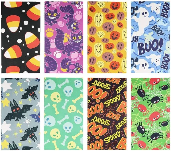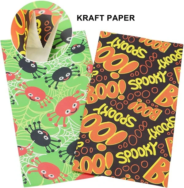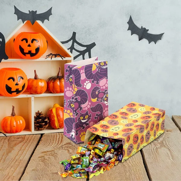 - Our Halloween Party Favor includes 72 pcs Halloween Candy Recyclable Goodie Paper Treat Bags for Kids Birthday Halloween Party Decorations. The bags include Bats, Halloween Treat Candy, Spooky Ghost, Spider with Web, Pumpkin, Skeleton etc. These Treat Bags measure 9.6 x 5 x 3 inches each.