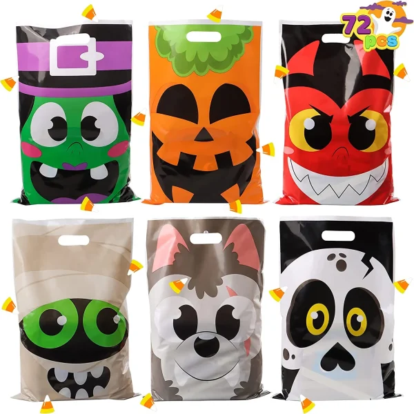 • Halloween Goody Bags include 72 pieces of plastic bags for trick-or-treating in 6 cute Halloween character designs like skull, pumpkin, devil, witch, and mummy. Each bag measures 17″ x 11″.