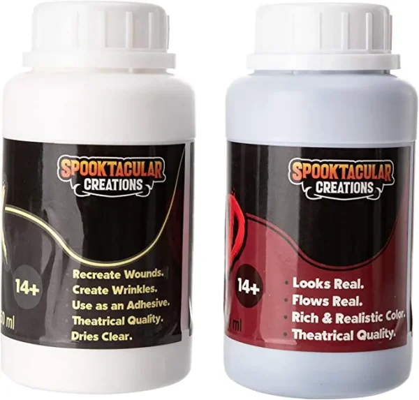 Decorate yourself with fake vampire blood, we offer bottles of blood to use as a refill for bleeding masks and chests so your bloody skeleton costume really scares your friends. Our blood options look and feel just like the real thing we promise it isn’t, but your friends don’t have to know! The package 8.45 oz liquid latex, 8.45 oz fake blood, and 1.76 oz wax. All-natural latex made from the rubber tree; cruelty-free. Use as adhesive. Use our wax to block out eyebrows or create injuries, knife cuts, gunshot wounds, bruises, burns, and broken limbs. Our fake blood features an incredibly vibrant blood red color that looks and flows like the real thing. It works well for producing spooky realistic special effects. This makes the application simple. For it to be applied to your skin evenly, gently squeeze the tube.